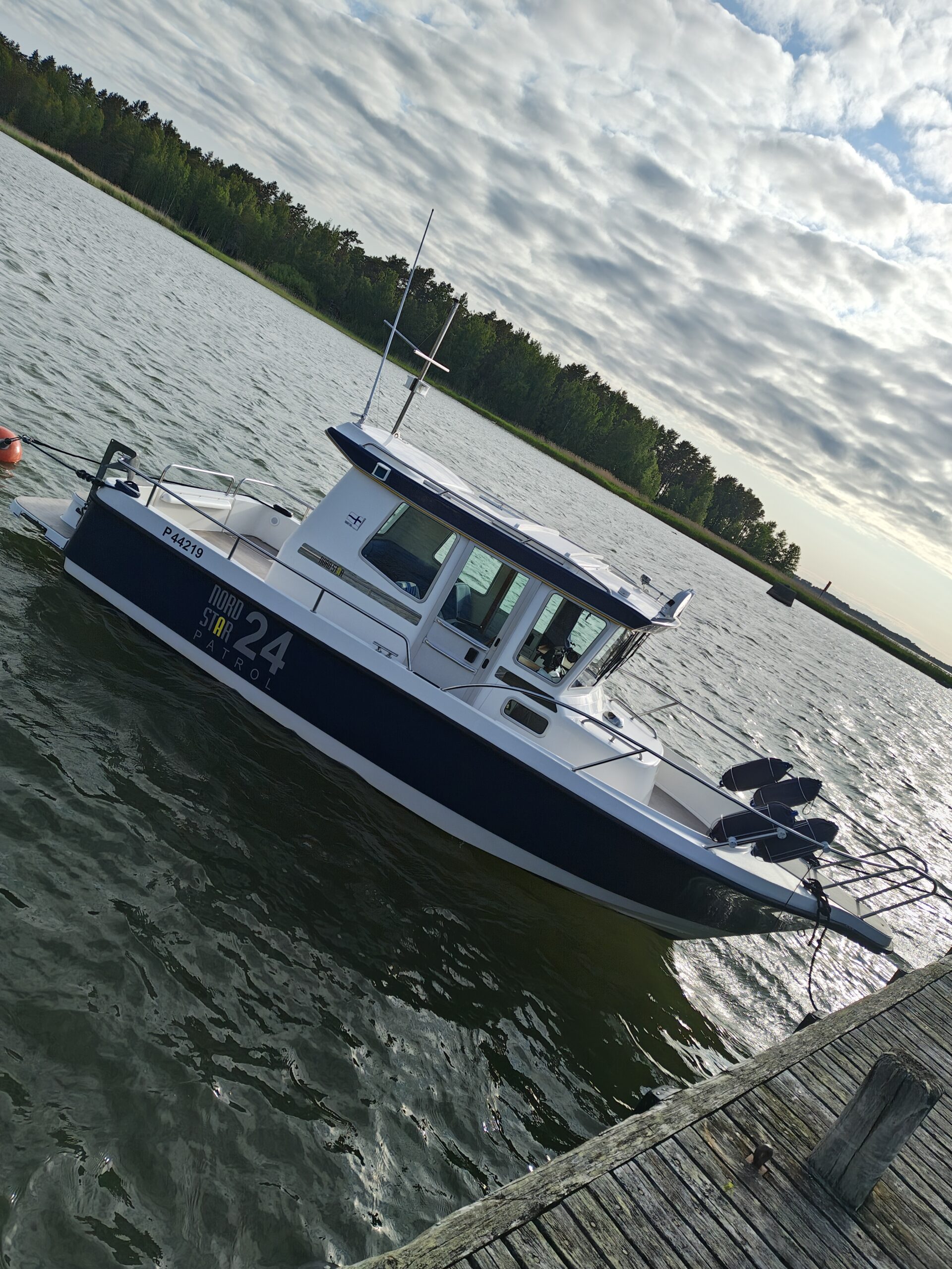 Vi använder Nord Star 24 Patrol – en sjösäker båt utrustad för havsbruk:
